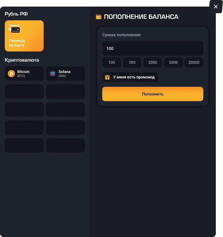 Для пополнения баланса откройте раздел “Кошелек” и выберите пункт “Пополнение”. Далее, выберите желаемый способ оплаты и нажмите “Пополнить”.